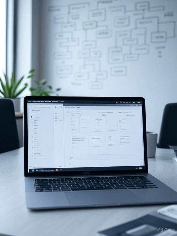 Modern workspace with laptop showing Jasper AI dashboard, creative writing flow chart in the background