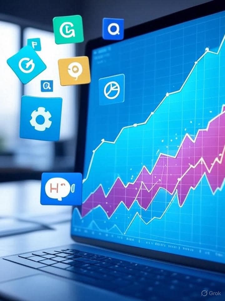 SEO traffic growth graph on computer screen with AI tools icons floating above